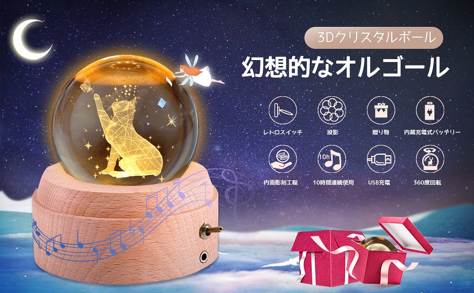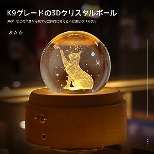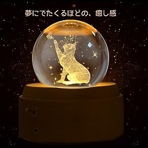 ![]() | 3D design makes it stylish. 3D art in the crystal with LED lights will bring you a healing experience with the illusion image and music box tones.Even if you don’t have to ring the music box, you can enjoy it just by lighting it up.Artfully sculpted light and sound. A three-dimensional “cat” image is processed through a laser beam on the inside of a clear and beautiful high quality crystal ball.(=’x’=)Makes a great gift. Great for a wide variety of occasions such as a gift for your wife who loves to wear it with everyday appreciation, birthday gifts for a cute child, or school entrance celebrations.Recommended as a birthday gift for women. |